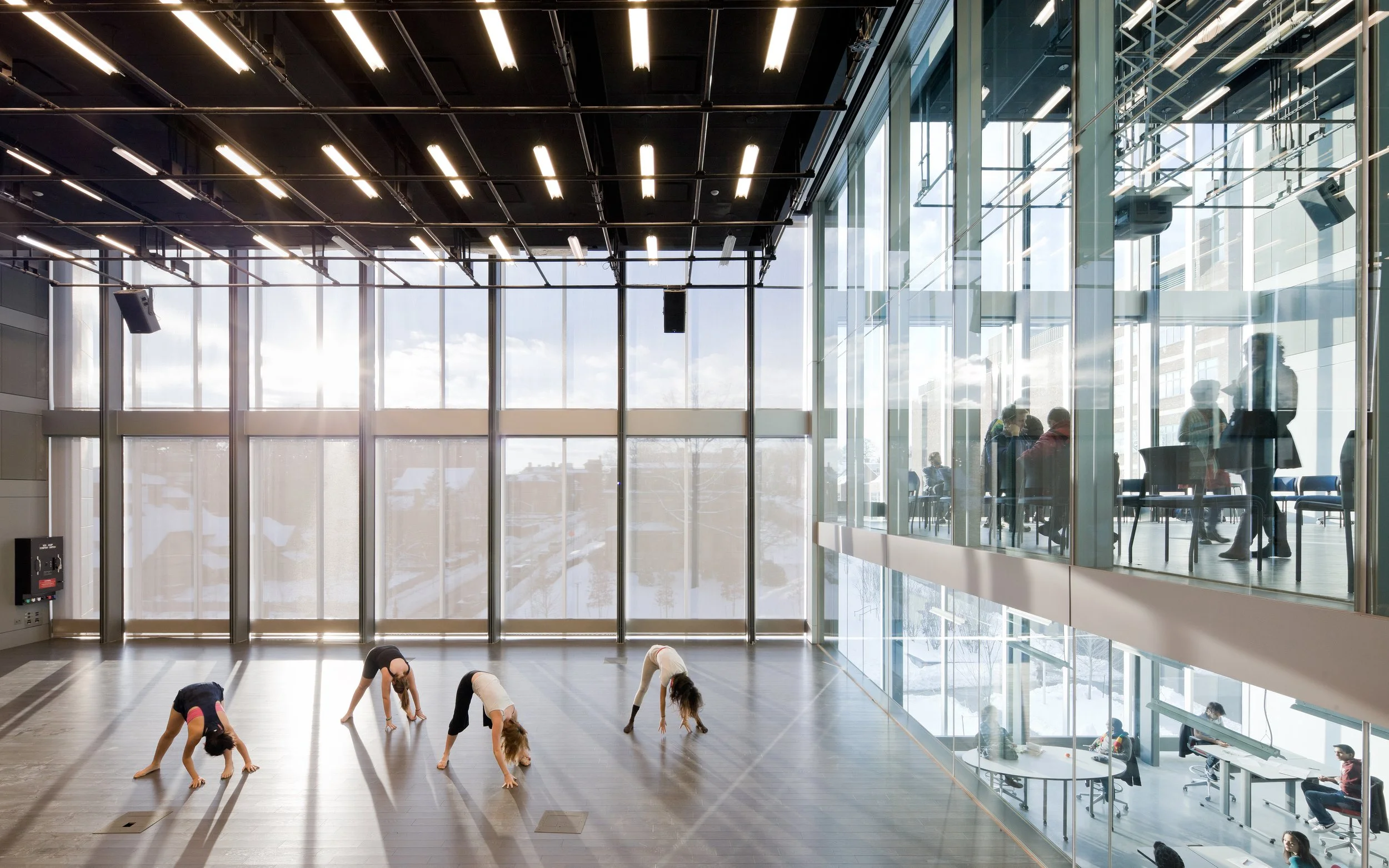 These two state-of-the art buildings for a business school reflect a more holistic pedagogy for education by reimagining typical programmatic arrangements, creating multifunctional spaces that foster a sense of community. The intertwining public and private areas allow for spaces where students, faculty, alumni, and practitioners can gather to exchange ideas. The lighting design supports this reorganization and innovative practice primarily through a careful and thoughtful balance of fixture density and light quality. The interweaving of student, faculty, and administrative spaces is expressed through an “architectural layer-cake” design approach. Transparent glass exteriors reveal connected multifunctional public spaces and transition into more opaque fritted glass facades for private faculty and administrative spaces.