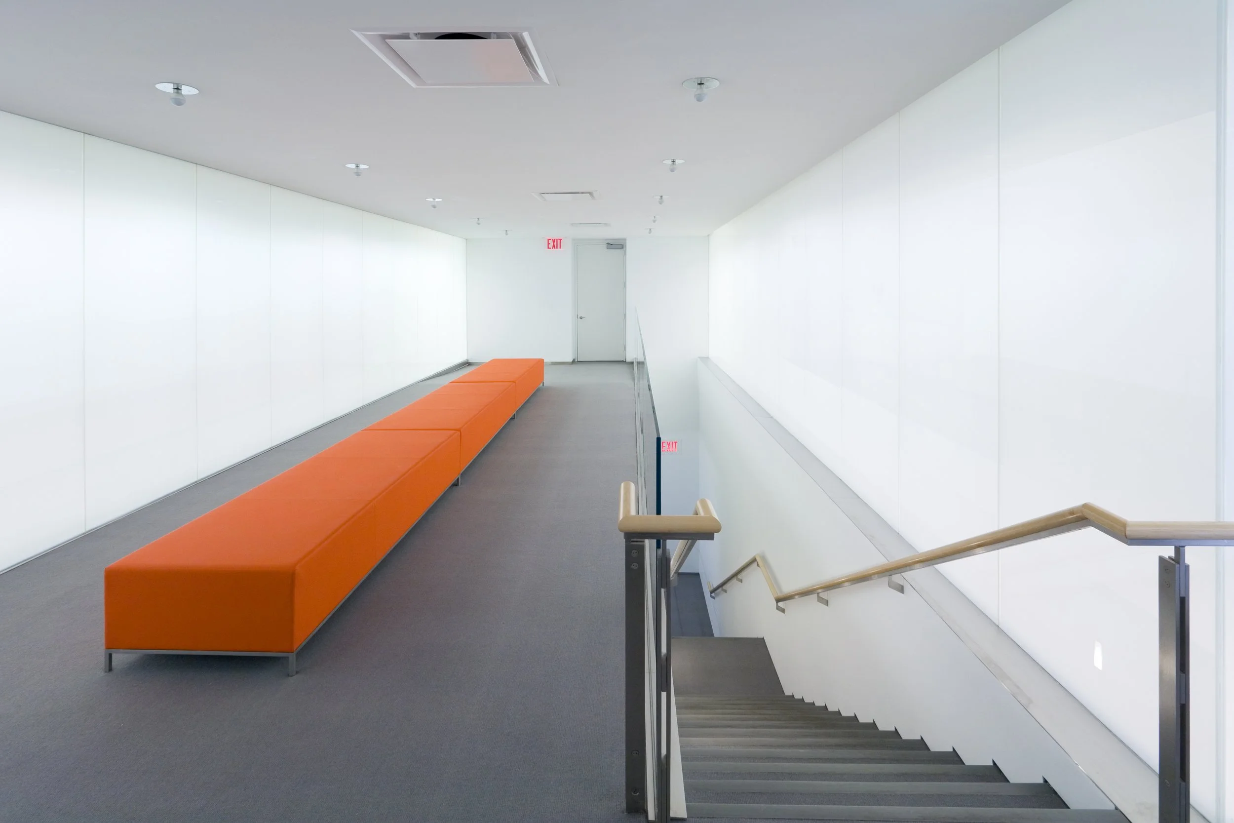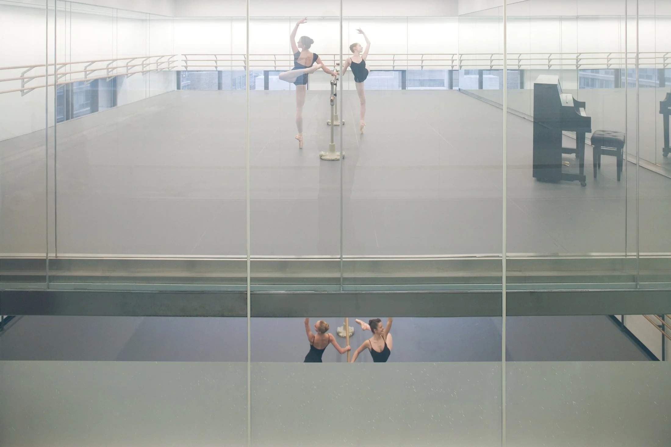 Linear ribbons of light illuminate these stacking dance studios, with the new upper studio floating within the original double height volume. The view into the space from the Parents’ Lounge is controlled by a milky translucent glass wall with a 4-foot band of electrified glass that changes to clear when switched on. Due to the demanding nature of the task, privacy, visibility and uniformity of light were carefully balanced and ultimately achieved through judicious choices of diffusion and light source. One of the primary lighting challenges was to assure that the dancers on the lower level did not feel confined and remained part of the larger space. Careful attention was paid to the reflections in the glazing walls as well as the mirrors.